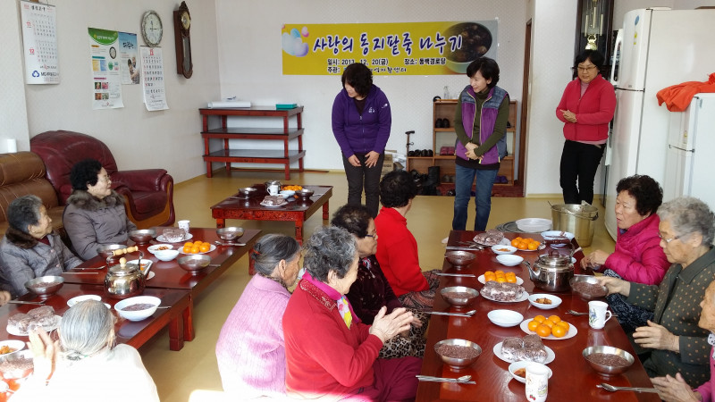 바른먹거리 사업단인 '풍성한 충무김밥'에서 국산 팥으로만 끓인 동지 팥죽과 겨울별미 무 팥시루떡, 밀감을 가지고 동백경로당을 방문하여 팥죽을 나누는 행사를 가졌다